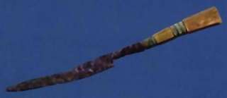 | 6. Késpenge stájeroktól, anyaga: kovácsolt vas, faragott csontkorong és kicsinyke rézlap, hossza: 19 cm, markolat hossza: 9,5 cm |  |