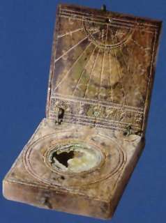 | 5. Zsebnapóra fából, kétrészes, két broncszegecs tartja össze, bronzakasztóval lehet becsukni, származási országa: Németország. Felső részén, a számlap alatt felismerhető az 1573-as évszám. Hosszúsága: 19 cm, szélessége: 5,7 cm, magassága: 2,2 cm (2000-es ásatáskor találták) |  |