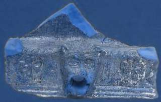 | 4. Egy mosdó(kagyló) törött részecskéje (kézimosáshoz használták az asztalon). Az edény négyszögű hasáb alakú préselt agyaglemezből, kívül zöldre lakozva; díszítésként „kettő felbélyegzett rozettán keresztül - egy oroszlánfejjel közötte”, hosszuság: 15 cm, magasság: 4,8-5 cm |  |