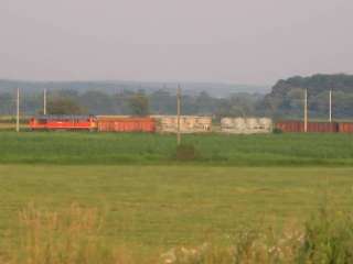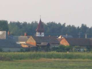 | Templomtorony közelről, távolról és a falu mellett közlekedő vonat | ![]() |